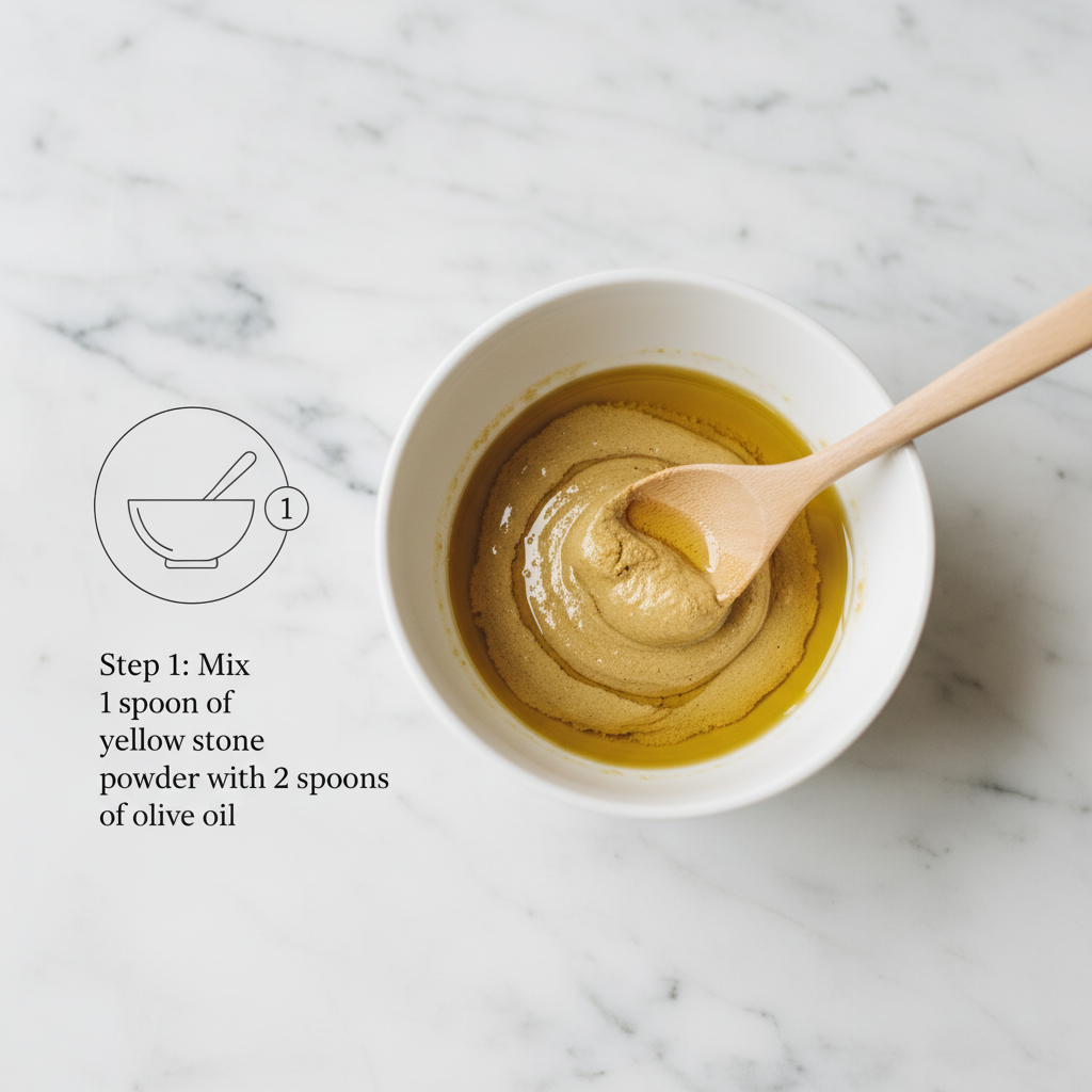 La pierre jaune est une poudre minérale 100 % naturelle, issue d’une roche sédimentaire extraite manuellement dans certaines régions d’Afrique centrale.